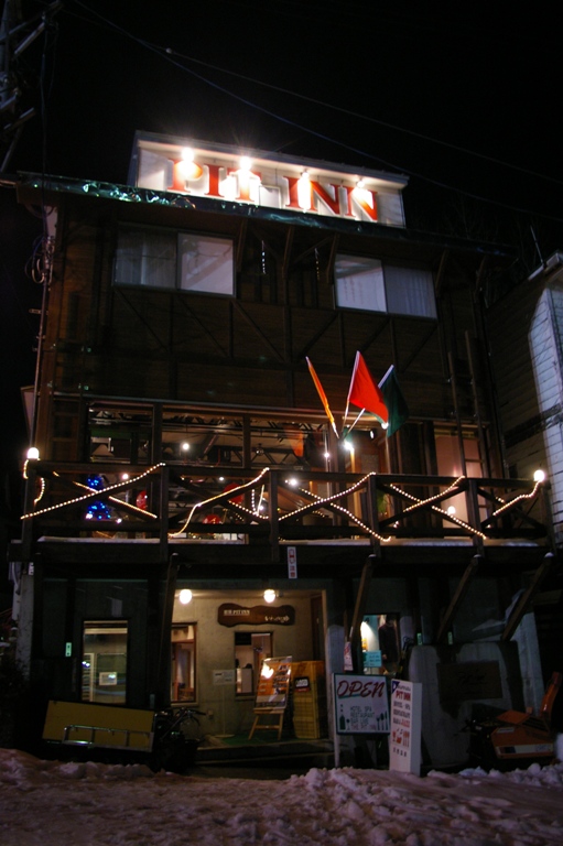 夜の「岩原ピットイン」概観(左)と、バーレストラン内の演奏ステージ