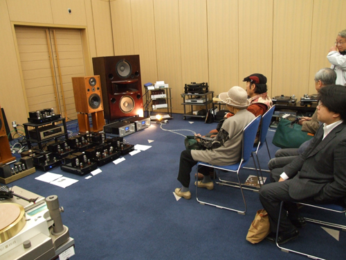 おなじアナログブースで行われた管球アンプと大口径スピーカーのデモも大盛況