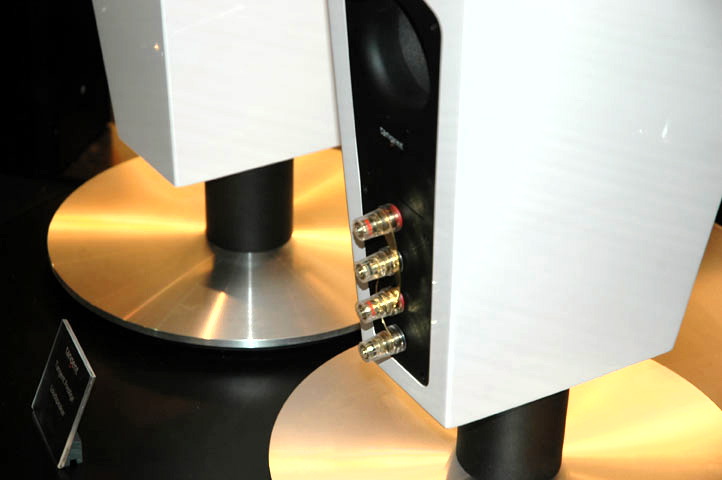 「Prestige」の端子部。タテ一列にレイアウトされた端子部の上部にダクトを装備する。円形のベース部もその存在感を引き立たせている