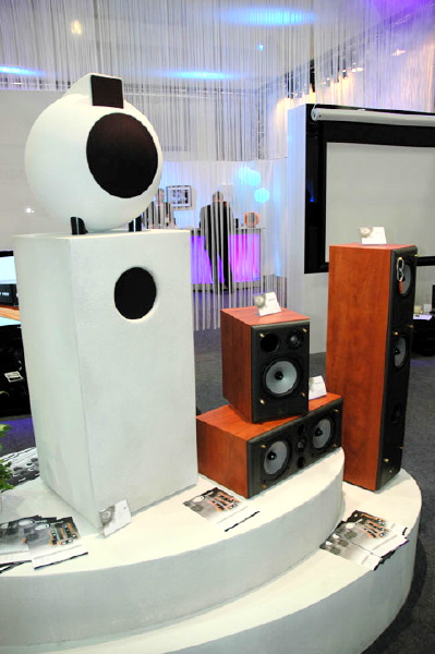 elipsonのスピーカーシステムも展示。ウッドのキャビネットに金属製のバッフルを持つシステムと、一風変わった外観のスピーカーも展示される