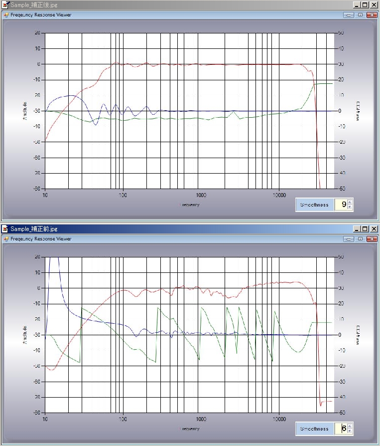 操作画面。元の特性と比較しながら、理想の特性をさまざまに設定できる。上は補正後、下は補正前