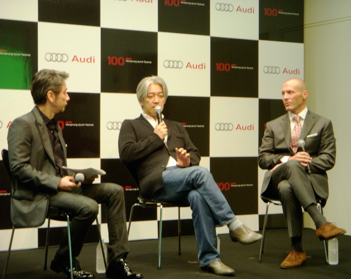 坂本龍一さんと共に、インタビューを受けるアウディジャパンのドミニク・ベッシュ社長(右)