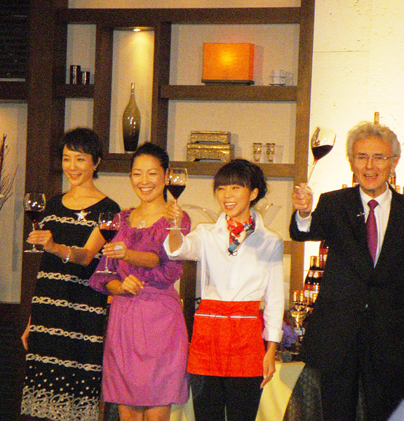 解禁となったボジョレー ヌーヴォーで乾杯を行うジョルジュ デュブッフ氏と久保純子さん、はなさん、羽田美智子さん