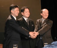 | ガッチリ手を組む久多良木健氏、セガ香山哲氏、ナムコ石川祝男氏 |