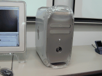 | 新デザイン“Quick Silver”を採用したPowerMac G4と、発表会が開催されたセミナー会場 |