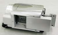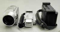 | <左>左からカメラユニット、バッテリーアダプターユニット、ビデオユニット <右>SDムービーカメラ時には、バッテリーを底部に装着する |