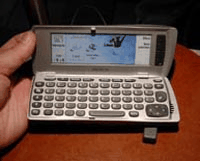 | ノキアのブースにて。ゲーム機能の付加した端末もある。持っている手と比べて、その小ささがわかりますか? |