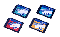 | 「マルチメディアカード高速シリーズ」右上から反時計まわりに、128Mバイト:「HB28B128MM2」、64Mバイト:「HB28D064MM2」、16Mバイト:「HB28E016MM2」、 32Mバイト:「HB28D032MM2」 |