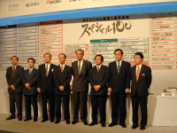 | <左>ズラリと勢揃いしたBSデジタル各社の役員陣 <右>スペシャル100番組の共通ロゴマーク |