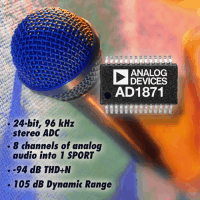 「AD1871」は24ビット96 kHzステレオ・オーディオA/Dコンバータだ。24ビットのコンバージョン・チャネルを2個備え、各チャネルはプログラマブル・ゲイン・アンプ、マルチビット・シグマ・デルタ変調器、デシメーション・フィルタで構成。THD+Nは-94 dB、ダイナミックレンジは105 dBで、DVD-Rやその他の新しいコンスーマ機器の高性能要求に対応している。AD1871の各入力チャネルは、シングルエンド入力あるいは差動入力のいずれにも適用できる。シグマ・デルタ変調器は独自のマルチビット・アーキテクチャを特長としており、32kHzから96kHzの標準オーディオ・サンプリング・レートで、全オーディオ帯域に渡って最高の性能を実現する。AD1871のオーディオ・データ・インターフェースは、I2S 、右詰め、左詰めのような、通常のインターフェース形式をすべてサポート。カスケード・モード機能もあり、最高4個のAD1871(8チャネル)で単一のDSP SPORTを駆動する構成が可能だ。カスケード・モードはとくにハイエンドのコンスーマ製品やプロフェッショナル向けのミキシング・コンソールのような、マルチチャネル・アプリケーションに適している。