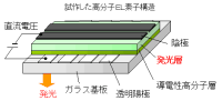 新素子は、燐光性高分子材料を用いた有機EL材料。高分子の有機EL材料では、これまで広く研究が進められてきた低分子の有機EL材料(柔軟性に乏しく丸めたりできない)に比べて、まだ発光の効率が低く寿命が短いという問題がある。つまり、大幅な高効率化・高輝度化は期待できないと言われていた。