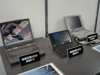 写真右は、垂直記録のハードディスクドライブ(を内蔵したPCの試作機)。年々大容量化するHDDの次なる高密度化技術である。小型でありながら大容量ストレージを求められつづける状況への回答として、100Gbit/inch2以上の高密度記録を実現した。