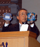 次に松下電器の三木氏が同規格の技術的な説明を行った。短波長の青紫色レーザーを用い、レーザーを集光する対物レンズの開口数(NA)を0.85としたことにより、ビームスポットを微小化。ディスクの光透過保護層厚は0.1ミリメートルで、ディスクの傾きによるレーザー光の収差を低減し、読み取りエラーの低減や記録密度の向上を図ったという。これにより、ディスクの記録トラックピッチをDVDの約半分の0.32ミクロンμmに微細化し、ディスク片面に最大27GBの高密度記録を実現した。またディスクはカートリッジに保護され、光ディスク記録再生面のキズや汚れを防止する。また同氏は、個人的な考えとして「Blu-ray-Discは12cmの光ディスクとして最後のフォーマットになるはず。今後は別の記録方式が台頭するだろう」とも述べた。