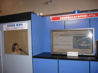 写真左の生放送字幕のための音声認識システムは、番組の音声をそのまま認識するのではなく、字幕キャスターが番組音声を聞きながら放送音声の要点を言い直し、画面上に表示するというもの。番組音声に背景雑音がある場合でも対応でき、省略や補完しながら言い直すことが可能なことから、認識性能と字幕の見やすさが向上するというもの。