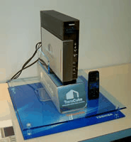 「TransCube10」には、ブロードバンドルータ、無線LAN(IEEE802.11b/2.4GHz)アクセスポイント、80ギガバイトHDD、テレビチューナー、MPEG2エンコーダ/デコーダLSI、可変ビットレート処理技術などが搭載され、自宅のノートPCと組み合わせることで多彩なエンタテインメントツールとしての真価を発揮する。