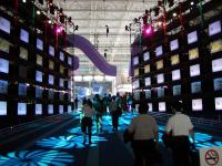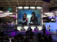 | <左>エレクトロニクスゾーンのエントランス <右>会場にはいると巨大なディスプレイを使ったデモが |