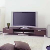 床にすわったままリラックスして、また優雅にプラズマテレビを楽しめるフロアタイプ。全高280mmのローアングルで心地よい空間を創出する。ダークブラウン・ウレタン塗装されたナラ柾目突き板を使用している。