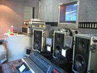 | 左:球場内にスタンバイされたサラウンドマイク 右:最先端の設備を構える中継車内部の様子 |