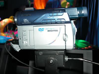 据え置き型のレコーダーに加えて、8cmディスクを使用するハンディカムの新製品が3種類登場する。DVDハンディカムの愛称で、デザイン、サイズは同社のDV方式のハンディカムを踏襲し、比較的コンパクトに仕上がっていた。ディスク装着面にDVDをイメージするデザインが導入されていることで、DVD方式のカメラであることがわかる。対応するディスクはDVD-RとDVD-RWの2種類で、記録時間は1時間を予定している。