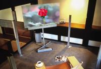 取り外し自在なスタンドの採用により、自在に移動が可能。スタンドを取り外してテーブルの上に立てて使用することもできる。また家庭内だけでなく、店舗店頭やショールーム、売り場などにも使えそうだ。