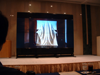 | DCROSSについて語る宣伝部の福間勉氏 / 160インチDLP方式リアプロジェクションパネル |