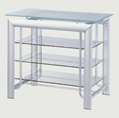 以下の3機種は、ガラスとパイプ素材をバランスよく構成した透明感のあるデザインを採用し、薄型テレビにマッチする。天板はフロストガラス、棚板はクリアガラスと2種類のガラスでデザイン性を向上させた。脚部はアルミ異型パイプにシルバーメタリック塗装仕上げ。奥行き40センチの薄型ラック。