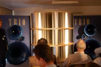デザインばかりでなく発想そのものからしてユニークなものが飛び出してくるのがスピーカーである。日本ではまずお目にかかれないような製品が、こういうショーに来ると必ずある。まずは巨大なベース・ホーンを備えたアバンギャルドのシステム。12インチ・ウーファー2個を内蔵したベース・ホーンが計6個積み重なっている(写真右)。すでに日本への輸入が決まっているが、面白系というのは失礼で実にすごい製品だ。今まで聴いたことのない音と言っていい。これは本日の別格。