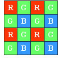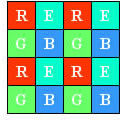 | <左>3色(RGB)カラーフィルターの配列 <右>今回開発した4色カラーフィルターの配列 |