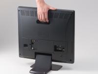 | <左>「LCD-TV192CBR」本体とリモコン <右>裏面には取っ手も設けられ、持ち運びがかんたん |