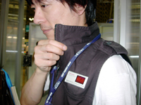 東北パイオニアのブースでは、有機ELディスプレイの展示に力が入れられている。ブースの係員自ら名札型の小型有機ELディスプレイを胸につけてアピールしている。最小のものでは、表示エリアが19.0×11.1mmのモノカラー パッシブタイプが、また高精細なものでは、表示エリアが19.9mm×19.9mmの65,000色フルカラー パッシブタイプが展示されている。