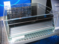 そのほかにもパナソニックは同社の最先端を行く技術展示をお披露目している。2層の記録面に50GB、ハイビジョンで4時間半の映像を記録できるBlu-rayディスクを参考展示。本製品に対応するレコーダーのプロトタイプも参考展示され、その高精細な映像を視聴することができる。本機ではDVD-RAMディスクの録画・再生にも対応する予定であるという。具体的な発売時期や価格などについてはまだ未定とのこと。そのほかには、赤外線とカメラで人間の手の動きを検知して入力を行うバーチャルキーボードに注目が集まっていた。