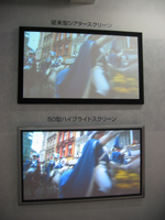 また、市場投入は全く未定だが、参考出品された「ハイブライトスクリーン」も注目される。このスクリーンは投射光の減衰が極めて少なく、明るい部屋でも高解像度・高コントラストが維持できるもので、軽量・薄型で壁掛けも可能。ロールタイプではなく、モバイル性には欠けるが、プロトタイプの50形スクリーンの映像はかなり明快で、室内で日常的に使用できそうなので、早期の実用化を期待したいものである。