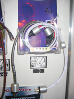 | pacific audioのブース(左)。ジャズ評論家・寺島靖国氏も試聴絶賛というZUCABLEの電源ケーブル |