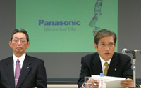| 決算発表を行った同社代表取締役社長の中村邦夫氏(左)と常務取締役の川上徹也氏(右) |