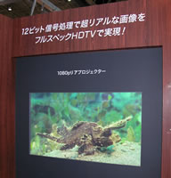 セイコーエプソンのブースでは、先頃技術開発を発表したフルスペックHDTV(1080p)対応のホームシアター向けプロジェクター用高温ポリシリコンTFT液晶パネルを搭載した実機をデモンストレーション展示している。今回のイベントではリアプロジェクションタイプの製品を使って、高精細な画像の投写デモが行われていた。12ビット信号処理に忠実に対応し、10億色を超える色再現性を獲得したというその映像の美しさが、会場に訪れた多くの人々を魅了していた。