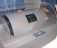 その他にもセイコーエプソンのブースでは、同社の独自開発技術である2.1インチ・インクジェット有機ELディスプレイのデモンストレーション展示を展開。ディスプレイ周辺の黒い額のデッドスペースを少なくし、表示部分が従来モデルよりもさらに明るく高精細になった。動画のスムーズな表示も実現し、将来はゲーム機などへの応用が視野に入れられている。また、同社で開発した3.8型カラーLCDモジュールの新製品デバイスを、0.1mmまで薄型化を実現したプロトタイプモジュールがデモ展示されていた。本製品は薄型化のみならず、曲面加工まで実現しており、「薄くて曲げることのできる液晶パネル」として来場者の関心を集めていた。本デバイスの0.5mm厚のモジュールを使ったデジタルフォトビュワー「PhotoPC Player P-1000」が同社より新しく発売される。