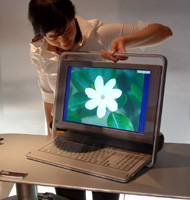 バイオPは、「はこぶ・つかう・しまう」をテーマに、室内での可搬性と収納性を考慮した、液晶ディスプレイ・キーボード一体型パソコンだ。本体を取り囲むハンドル部分により持ち運びが簡単で、折りたたみ機構の採用により収納性にも優れている。TVやDVDの快適な視聴を提案しており、高輝度・高コントラスト・低反射の17型ワイドクリアブラック液晶画面を搭載したほか、MPEG2ハードウェアエンコーダーを搭載している。また、バッテリー内蔵型なので電源を切ることなく移動することも可能だ。