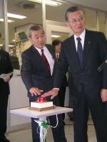 | 11時放送開始と同時にボタンを押すNHK関根放送総局長(右)と橋本理事(写真左)。渋谷の放送センターでは関連イベントを開催(写真右) |