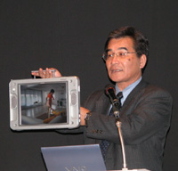引き続いて前田氏が壇上に登り、新製品の細かな紹介を行った。「ホームネットワーク環境を超え、ブロードバンドの活用により、ますます広域なネットワーク環境でのAVエンターテインメントを実現した、究極のロケーションフリーテレビです」と新製品の魅力を語った前田氏。前モデルよりも格段に画質が向上し、ワイヤレスながら安定した映像を実現したという。遠隔地で楽しむ際にも、タッチパネルリモコンを液晶画面表示し快適な操作を実現。本製品は約12型の画面サイズだが、将来はより携帯性を高めたコンパクトな製品も開発中であることが発表会の最後に明らかにされた。