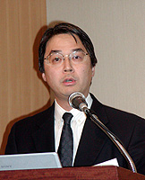 | <左>発表会の模様 <右>日本TI(株)ハイパフォーマンス・アナログ事業部事業部長 岩崎広司氏 |