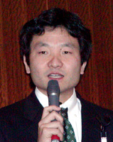 | <左>インタービデオジャパン(株)代表取締役社長 田中俊輔氏 <右>Aopenの試作PC |