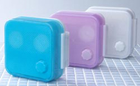 本製品は、バスルームなど湿気の多いところでも使用可能な防沫設計を施したポータブルスピーカー。新シリーズではデザインを一新すると共に、ボリュームつまみがブルーに光る“プチ照明”を新たに採用した。お手持ちのポータブルオーディオ機器(CD、MD、カセットテープなど)のヘッドフォン端子またはライン出力端子に接続し、ケース内に入れて使用する。