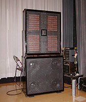 「セレスティアルボイス」という名前は、“天空の声”という意味。最大の特徴は、コーン型スピーカーを使わず、フラットパネルスピーカーを採用している点。フラットパネルタイプでは、平面波で音が伝わるため、音の減少が小さいほか、音波が対象に向かって垂直に進み、壁などの干渉が低減するというメリットがある。また本機では、歪みを大幅に抑えることに成功し、標準的な15インチコーンウーファーと比較して、7分の1の歪みレベルを実現した。