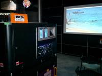 ■写真右:北米バルコのブース。新しい業務用DLPプロジェクターが登場間近らしい。HDD(DSR)からLAN接続で、65Mbpsもの大容量のデジタルコンテンツを映し出していた。