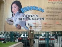 | 上写真 左)会場の上海エキジビション・センター 右)会場の大看板の前に立つ筆者 |