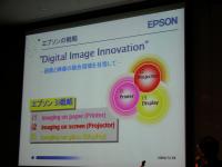 はじめに花岡氏より、今回の製品における開発の経緯と、同社の有機EL事業に関する戦略の説明が行われた。花岡氏は同社のディスプレイ事業戦略として「エプソン 3i戦略」の内容を明らかにした。これによれば、「i1 imaging on paper(プリンター)」「i2 imaging on screen(プロジェクター)」「i3 imaging on glass(ディスプレイ)」の3つの領域において、今後エプソンブランドは「画像と映像の融合領域を目指した」事業戦略を展開していくという。