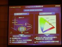 本日行われた発表会では、まずセイコーエプソン(株)代表取締役副社長の丹羽憲夫氏が登壇し、同社の企業ビジョンについて説明した。同氏は「弊社の基本戦略は、<imaging on paper=プリンター><imaging on screen=プロジェクター><imaging on glass=ディスプレイ>の3i戦略。このうちプロジェクター事業では、すでにデータ用液晶プロジェクターや液晶デバイスなどで世界的に高いシェアを得ている。また、弊社には画像処理などコア技術の蓄積がある。これらの技術を融合し、今回リアプロ事業に参入した」と説明した。また同氏は「今後も製品の充実を図り、市場における存在感を増していく」とも述べ、継続的にリアプロ事業へ力を入れていくことを強調した。
