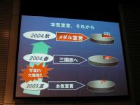 はじめに芦澤氏が登壇し、CANONブランドと新製品の販売戦略と語った。同社では今後、2004年秋ごろ各社のDVC新製品が群雄割拠する時期おいて、今回発表した新製品を中心により一層のシェア拡大を実現するため「メダル宣言」を高らかに掲げ、マーケティング、販売を強化していく考えであるという。「写真もビデオもダブルOK!」をキャッチコピーに、「写真DV」のコンセプトをコンシューマーに強くアピールした同社昨年のモデル「IXY DV M2 KIT」のヒットにより、「“デジタルフォトといえばキヤノン”というブランドイメージが今やユーザーの皆様に浸透して参りました」と芦沢氏は語る。