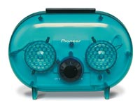 本製品は、バスルームなど、湿度の高いところでも使用可能な防沫設計を施したポータブルスピーカー。手持ちのポータブルオーディオ機器のヘッドフォン端子、またはライン出力端子に接続し、本体ケース内に入れて使用することが可能だ。乾電池駆動のアンプを内蔵し、音量ボリュームコントロールも搭載した。