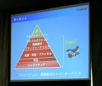 はじめにキヤノン販売(株)コンスーマ商品企画本部本部長である松浦清氏が新製品の販売戦略について語った。松浦氏は新製品の販売ターゲットとして「コンテンツクリエーターの方々を中心に、ハイアマチュア、文教用途など幅広いハイエンド志向のユーザーの皆様が対象になるだろう」と語った。8月下旬の発売予定時期を目前に「設定したターゲット層にむけて製品の魅力を余すところなく伝えて行けるよう、プロモーション活動を練り上げていきたい」と松浦氏は抱負を語った。